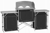 Szafka posiada nie tylko przestronny blat główny, ale również dwa dodatkowe boczne blaty, umożliwiające wygodne przygotowywanie i serwowanie potraw. Osłonka przeciwwiatrowa ułatwia gotowanie, chroniąc przed niekorzystnymi warunkami atmosferycznymi, a regulowane nóżki zapewniają stabilność na każdym podłożu.
