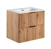 Zestaw składa się z trzech elementów: szafki pod umywalkę, umywalki meblowej oraz syfonu Preloc 400. Fronty szafki ozdobione są frezowanymi ryflami pionowymi, dodając elegancji i stylu całej kompozycji. Do wyboru są trzy kolory uchwytów: złoty połysk, chrom połysk i czarny mat, co pozwala dopasować zestaw do własnych preferencji.