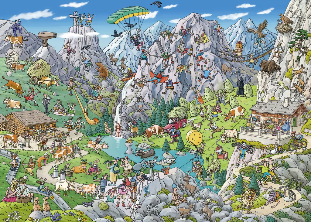 Puzzle HEYE przedstawiające grafikę "Szalona wyprawa w góry" składają się z 1000 elementów. Po ich ułożeniu otrzymamy obraz o wymiarach 50,0 x 70,0 cm. To prawdziwa gratka dla wszystkich miłośników puzzli humorystycznych.