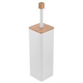 Praktyczna szczotka do WC z elementami z naturalnego drewna bambusowego. Szczotka WC wykonana została z wysokiej jakości stali malowanej na biało (mat). Górna część szczotki WC i pokrywa ozdobiona została elementem wykonanymi z naturalnego drewna bambusowego odpornego na wilgoć. Wewnątrz pojemnika na szczotkę znajduje się osłonka / mniejszy wyjmowalny pojemnik na ociekającą wodę, dzięki czemu pojemnik na szczotkę jest suchy i czysty wewnątrz.