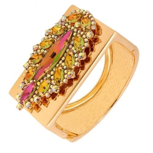 Niezwykle kolorowa bransoletka z kamieniami Wymiary bransoletki średnica 7 cm, szerokość 3,8 cm Ze względu na różne ustawienia monitorów oraz różną jakość wyświetlaczy zastosowanych w urządzeniach mobilnych, kolory przedstawione na zdjęciach mogą nieznacznie różnić się od rzeczywistych. Dokładamy wszelkich starań, aby na stronie Sklepu przedstawiać tylko realne zdjęcia produktów, jak najbardziej zbliżone do rzeczywistości. Stal szlachetna pozłacana. Gwarancja pozłocenia i jakości. Warstwa złota naniesiona w metodzie - PVD- napylanie próżniowe jonami tytanu, czy też azotkiem tytanu jest nowoczesną metodą nanoszenia powłok o bardzo dużej trwałości. * Pokryte jest w całości 4 - 8 mikronową warstwą 14K, 18K i 24K złota. * Warstwa złocenia pokryta jest lakierem jubilerskim, który zabezpiecza powłokę złota przed ścieraniem i nadaje wspaniały połysk * Biżuteria wykonana ze stali szlachetnej-należy do grupy stali o strukturze austenitycznej ( podobna chirurgiczna 316 L) : - jest hipoalergiczna i nie uczula, ponieważ nie emituje związków niklu do organizmu - nie koroduje, nie odbarwia się i długo cieszy swoim blaskiem - ścieralność uzależniona od noszenia i od pH ciała - nie wymaga specjalnej konserwacji jak biżuteria ze srebra czy złota