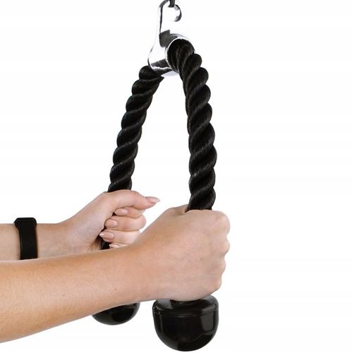 Ten uniwersalny sznur-uchwyt pozwala na wykonywanie wielu podstawowych ćwiczeń angażujących różne partie mięśniowe, takie jak barki, klatka piersiowa, plecy, triceps i brzuch. Metalowa końcówka o średnicy 1,5 cm umożliwia zamocowanie do każdego wyciągu – zarówno górnego, jak i dolnego.