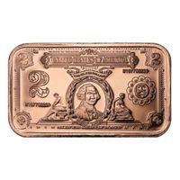 Sztabka $2 US Thomas Jefferson Banknote 1 uncja miedzi łączy ikonografię amerykańskich banknotów z czasów, gdy srebrne certyfikaty stanowiły reprezentatywny pieniądz „podparty srebrem” składowanym w skarbcu. Sztabkę wybito z miedzi próby 999 o masie 1 uncji AVDP (28,349 g). Czytelne oznaczenia metalu i wagi zapewniają przejrzystość specyfikacji. Wzór eksponuje portret Thomasa Jeffersona oraz bogate ornamenty, oddając ducha epoki przed wprowadzeniem współczesnego formatu i standardu rezerwy federalnej.