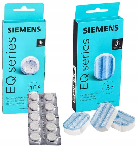 Oryginalne tabletki czyszczące i odkamieniające Siemens TZ80002B oraz TZ80001B to gwarancja wyjątkowej jakości, dedykowana dla ekspresów Siemens i Bosch. Zestaw zawiera 3 tabletki odkamieniające (każda po 36g) i 10 tabletek czyszczących (każda po 2,2g), które skutecznie usuwają kamień, osad, tłuszcz z kawy i fusy, zapewniając optymalne działanie urządzenia na co dzień.