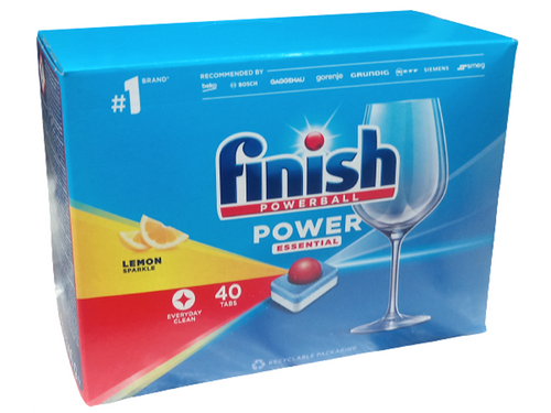 Tabletki do zmywarki Finish Power Essential to klasyczne dwuwarstwowe tabletki, które posiadają funkcję wstępnego namaczania i zmiękczania trudnych do usunięcia resztek jedzenia a dzięki nowej formule Powerball wytwarzającej musujące bąbelki środek czyszczący rozprowadzany jest w taki sposób aby docierał wszędzie tam gdzie jest potrzebny, usuwając pozostałości żywności oraz tłuszcz. Kartonik zawiera 40 tabletek.