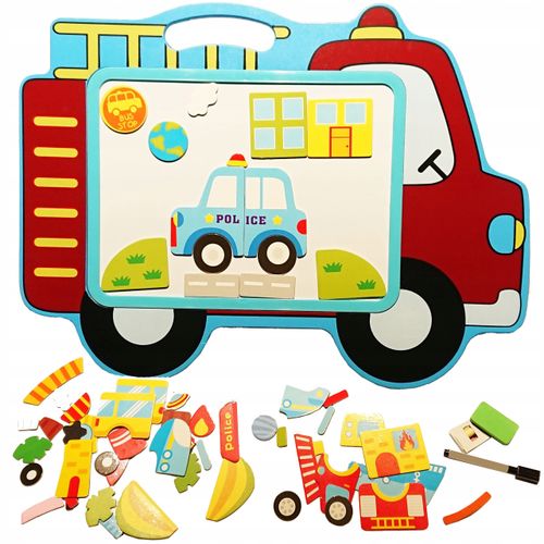 Dzięki dołączonym magnesom, dziecko przez długi czas może składać samochody (takie jak straż pożarna, policja), budynki, różne scenki a także uczyć się pisać na tablicy.