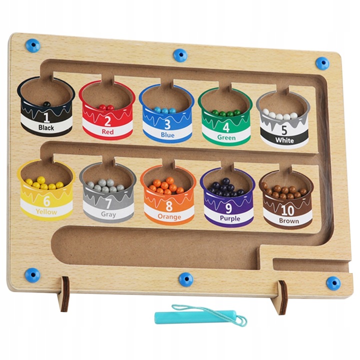 ✔️ Zadaniem dziecka jest posortowanie kolorowych kulek za pośrednictwem magnetycznego długopisu, zgodnie z kolorem danego pojemnika i liczbą, jaka się na nim znajduje.