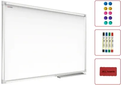 Nasza tablica magnetyczna jest dostarczana z kompletem potrzebnych akcesoriów, takich jak półka na akcesoria, gąbka, zestaw magnesów oraz zestaw markerów. Wszystko, czego potrzebujesz do natychmiastowego korzystania z produktu, jest już w zestawie.