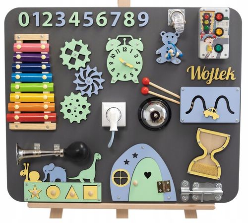 Różnorodne elementy tablicy angażują zmysły dotyku, słuchu i wzroku dziecka, rozwijając jego koordynację wzrokowo-ruchową, sprawność manualną oraz poznawanie otaczającego świata w bezpieczny i przyjemny sposób.