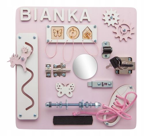 Poprzez zabawę różnorodnymi elementami tablicy, dziecko doskonali koordynację ręka-oko oraz rozwija zdolności logicznego myślenia. Elementy takie jak labirynt z ruchomym jednorożcem, pręt gwintowany z nakrętkami i sorter z puzzlami, stymulują rozwijające się umiejętności manualne i poznawcze.