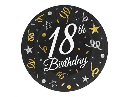 Talerzyki papierowe w kolorze czarnym z dodatkami białego i złota z motywem urodzinowym: 18th Birthday. W opakowaniu znajduje się 6 sztuk talerzyków o średnicy 18 cm. Idealnie nadają się na przyjęcia w domowym zaciszu, aby dodać akcent elegancji. Dzięki tak pięknym talerzykom możesz uszczęśliwić przyjaciela i sprawić mu niesamowitą niespodziankę.