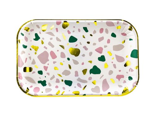 Talerzyki papierowe w kolorze białym matowym, z kolorowym wzorem i metalizowanym złotym nadrukiem, wymiary ok. 22 x 13,5 cm.