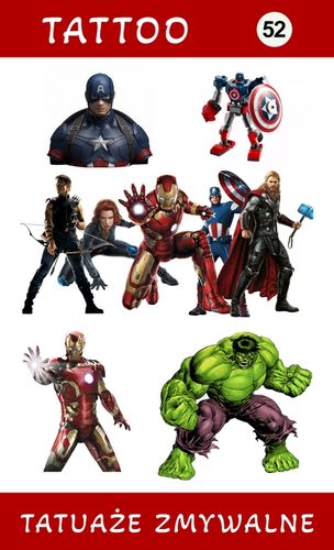 Nie zwlekaj! Tatuaże zmywalne Avengers sprawią, że Twoje dzieci będą wniebowzięte, a Ty będziesz mieć pewność, że wybrałeś bezpieczny i wspaniały produkt dla swojego malucha. Zamów już dziś i podaruj swojemu dziecku chwilę magii!