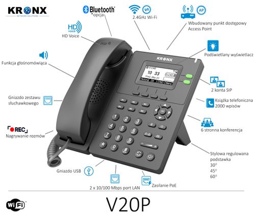 Telefon KRONX IP V20P z POE /SIP 2 linie SIP
