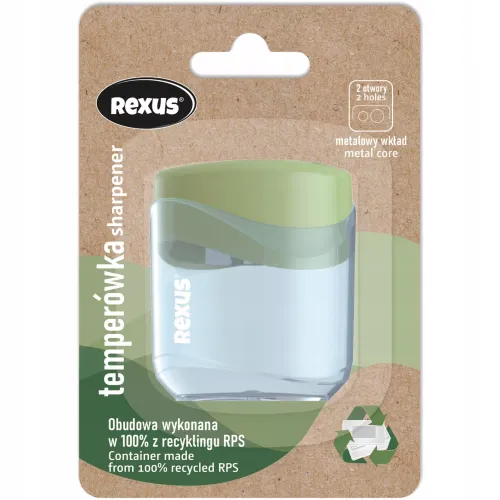 Solidna i trwała temperówka doskonale sprawdzi się w domu, w szkole, czy na zajęciach. Posiada 2 różnej wielkości otwory - nadaje się do kredek i ołówków o różnych średnicach. Duży, transparentny pojemnik na wiórki pozwala na naostrzenie większej ilości kredek lub ołówków bez konieczności ciągłego wyrzucania. Obudowa wykonana w 100% z recyklingu RPS