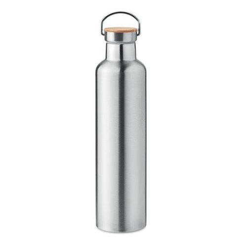 Dwuścienny termos próżniowy z bambusową pokrywą i uchwytem do przenoszenia.