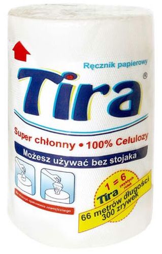 Ręczniki papierowe Tira to praktyczne wyposażenie każdego domu, firmy lub biura. Dzięki doskonałej chłonności i wysokiej gramaturze pomagają usuwać nawet ciężkie zanieczyszczenia w kuchni lub łazience. Bez obaw można je stosować do mycia oraz polerowania okien czy luster, a także szklanych stolików i witryn – ręczniki papierowe Tira nie pylą oraz nie pozostawiają nieestetycznych smug. Produkt sprawdzi się jednak nie tylko w czasie porządków, prezentowane ręczniki posiadają certyfikat materiału nadającego się do kontaktu z żywnością. Ręczniki papierowe Tira cechują się wysoką jakością, za którą odpowiada przede wszystkim ich wykonanie – 2-warstwowe listki stworzone ze 100% celulozy. Ponadto dzięki wyciąganej gilzie nie trzeba martwić się o dodatkowy stojak. Ręcznik papierowy Tira ma imponującą długość 66 metrów, dzięki czemu jest niezwykle opłacalnym wyborem — starczy na zdecydowanie dłużej niż standardowe produkty tego typu.
