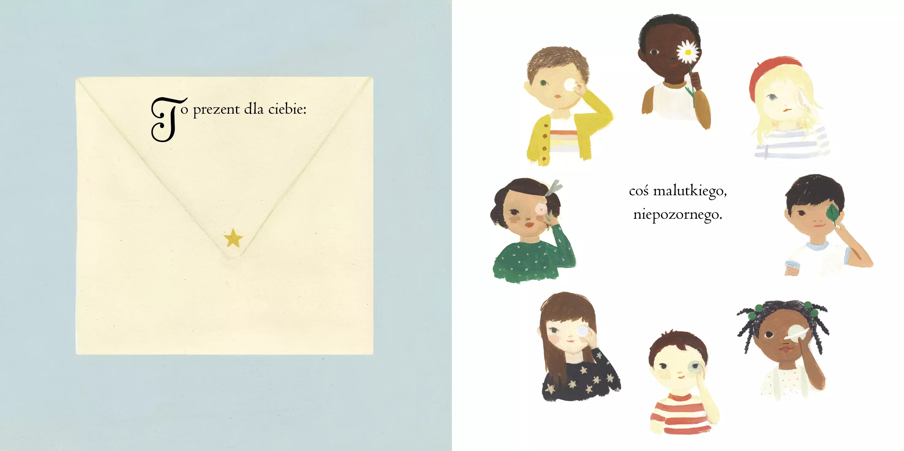 Od piórka, przez uścisk, po zachód słońca – książka uchwyca te niezwykłe dary, by pokazać dzieciom, jak bardzo są kochane i jak niezwykły jest świat, który dzielimy. Przepiękny prezent od jednego serca dla drugiego. Emily Winfield Martin, autorka Kiedy na ciebie patrzę, Wyśnionych marzeń i Marzycieli, z czułością i refleksją ukazuje różne sposoby obdarowywania i okazywania miłości. Codzienne chwile są jak pięknie zapakowany prezent – możemy odnaleźć zachwyt zarówno w drobnych gestach, jak i w wielkich momentach.