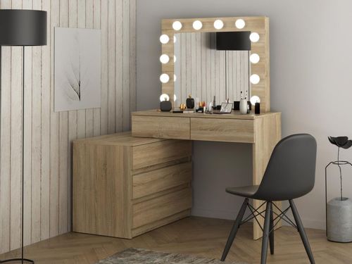 Odkryj elegancję i funkcjonalność z toaletką OVIS w kolorze dąb sonoma! Ta stylowa toaletka, idealna do sypialni lub salonu, to doskonałe połączenie designu i użyteczności. Wykonana z wysokiej jakości płyty laminowanej o grubości 18 mm, toaletka charakteryzuje się trwałością, co sprawia, że będzie służyć Ci przez długie lata.