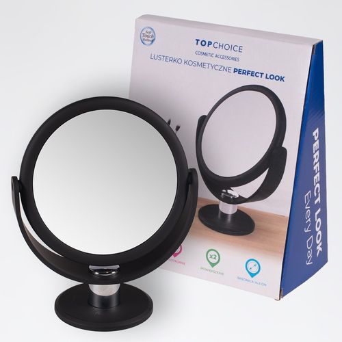 LUSTERKO KOSMETYCZNE PERFECT LOOK. Okrągłe: średnica 14,5 cm, 17 cm. Dwustronne: jedna strona obraz rzeczywisty, druga dwukrotne powiększenie. Przenośne i obrotowe. Wykonane z wysokiej jakości tworzywa ABS pokrytego gumowana powłoka typu soft touch