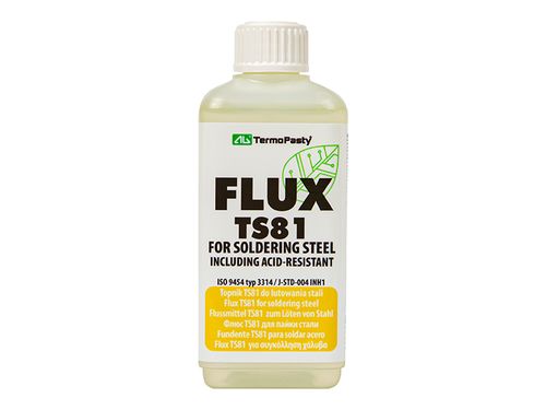 Topnik TS-81 100 ml AG Ciekły, bezkalafoniowy, wysoko aktywny topnik typu 3.2.1 A wg ISO 9454-1, stanowiący mieszaninę związków nieorganicznych i organicznych. Przeznaczony do lutowania elementów z różnego rodzaju stali (w tym kwasoodpornej) oraz elementów ze stopów chrominikielowych. Zastosowanie: Stopy chromowoniklowe Stal (w tym kwasoodporna) Mosiądz Blacha ocynowana Cynk Blach i rur z miedzi, stali nierdzewnej Stosowanie: Topnik nanosimy dowolnymi, dostępnymi sposobami. Pozostałości topnika są korozyjne i bezpośrednio po lutowaniu należy je zmyć najpierw zimną, a następnie ciepłą wodą ( temp. ok 50°C ) Specyfikacja: Producent: AG TermoPasty Opakowanie: Pojemnik 100ml Wygląd: przeźroczysta ciecz, lepka Zapach: ostry, drażniący Aktywność metodą statyczną w temp. 250°C: -pow. rozpływu stopu Sn60Pb40 140 mm2 PH (1% roztwór wodny): 1,2 Gęstość w temp. 20°C: 1,27 g/cm3