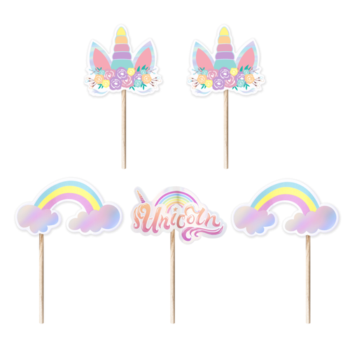Dekoracje do muffinek wykonane z papieru z motywem jednorożca, wymiary ok. 9 cm.
