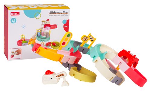 | Tor, zjeżdżalnia dla autobusów, do kąpieli dla dzieci od osiemnastego miesiąca życia. Kolorowy tor umili niejedną kąpiel. Wykonany został z najlepszej jakości materiałów, bezpiecznych dla dziecka w żywych kolorach. Zestaw posiada przyssawki, dzięki którym można go przymocować do wanny czy innej płaskiej powierzchni. Po ustawieniu autobusów na starcie toru wystarczy polać je prysznicem, a popędzą torem prosto do wody.