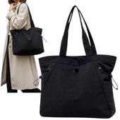 Ta wysokiej jakości czarna torba shopper bag wyróżnia się nie tylko pojemną i lekką konstrukcją, ale także przemyślanymi detalami. Oferuje przestrzeń na wszystkie niezbędne rzeczy, z podszewką i kieszonkami wewnętrznymi – jedną zapinaną na zamek i drugą naszytą bez zamka – co zapewnia łatwy dostęp i organizację w każdym momencie dnia.