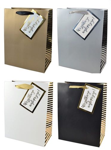 Torby Kukartka z serii Q są wykonane z grubego, satynowego papieru, mają zdobienia ze złotej/srebrnej folii i rączki z atłasowej tasiemki. Są piękne, solidnie wykonane i stanowią idealną oprawę dla każdego prezentu.