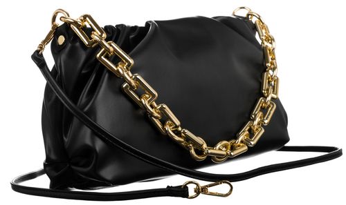 Torebka zawieszona jest na masywnym łańcuchu w złotym kolorze. W zestawie otrzymasz także doczepiany karabińczykami długi pasek na ramię. Jego długość to 112 cm.