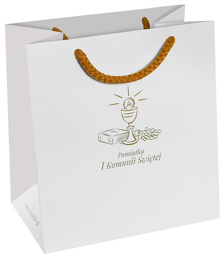 Torebka komunijna biała ze złotym nadrukiem oraz złotym sznurkiem