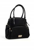 Ta wyjątkowa torebka damska Monnari w czarnym kolorze z logowanym materiałem emanuje klasą i precyzją wykonania, łącząc trwały materiał z lakierowaną ekoskórą. Złote detale i metalowe logo dodają subtelnego luksusu, a praktyczne kieszenie z przodu i po bokach zapewniają łatwy dostęp do codziennych niezbędników, gwarantując niezawodność na każdym kroku.