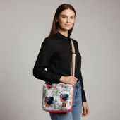 Urocza torebka handmade, która łączy różową ekoskórę z tkaniną w oryginalny motyw myszki w otoczeniu tropikalnych liści i kwiatów. Pełna kolorów i pozytywnej energii, doda uroku każdej stylizacji. Idealna na co dzień, na spacer czy wakacyjny wyjazd.
