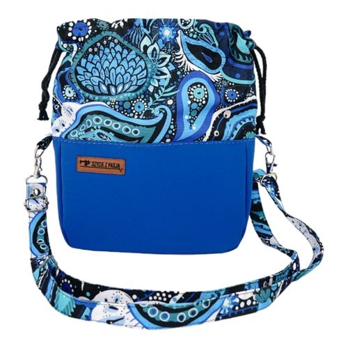 Torebka ma zaokrąglony kształt z gładkim matowym wykończeniem w uderzającym niebieskim kolorze. Górna część zdobiona jest skomplikowanym wzorem paisley w żywych odcieniach niebieskiego, czarnego i białego, co dodaje dekoracyjnego kontrastu do jednolitej podstawy.