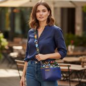 Pełna koloru mała torebka w kształcie sakiewki, uszyta z połączenia eleganckiej granatowej ekoskóry i wzorzystej tkaniny poliestrowej z motywem ludowych kwiatów. To wyjątkowe połączenie tradycji i nowoczesności – idealne dla kobiet, które lubią oryginalne, ręcznie szyte dodatki.