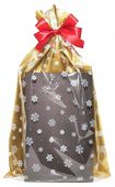 Torebki ozdobione są unikatowym, świątecznym nadrukiem białych śnieżynek na przezroczystej folii. Tył torebki ma delikatnie prześwitujący, złoty kolor, nadając im elegancki i świąteczny wygląd.