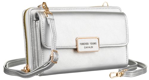 Na froncie torebko-portfela znajduje się praktyczna kieszeń na telefon o wymiarach 8,5 x 16,5 x 1,5 cm. Kieszeń posiada klapkę z zapięciem typu zatrzask.