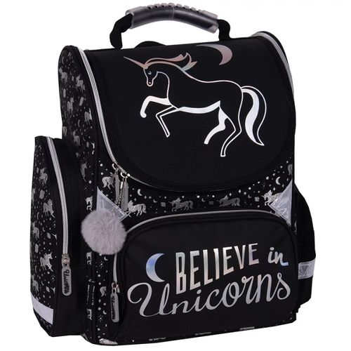 Śliczny tornister szkolny Jednorożec posiada jedną obszerną komorę, zapinaną na zamek dwukierunkowy z ozdobnymi pullerami ułatwiającymi zamykanie.