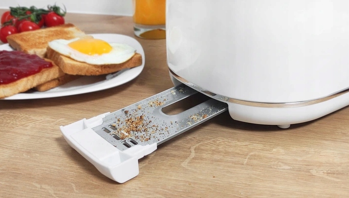 Model TSS802WH posiada antypoślizgowe, gumowane podkładki, dzięki którym stabilnie trzyma się nawet bardzo śliskich powierzchni. Tacka na okruchy pomaga utrzymać porządek, zaś kompaktowe rozmiary oraz możliwość zwinięcia kabla zdecydowanie to ułatwiają jego przechowywanie.