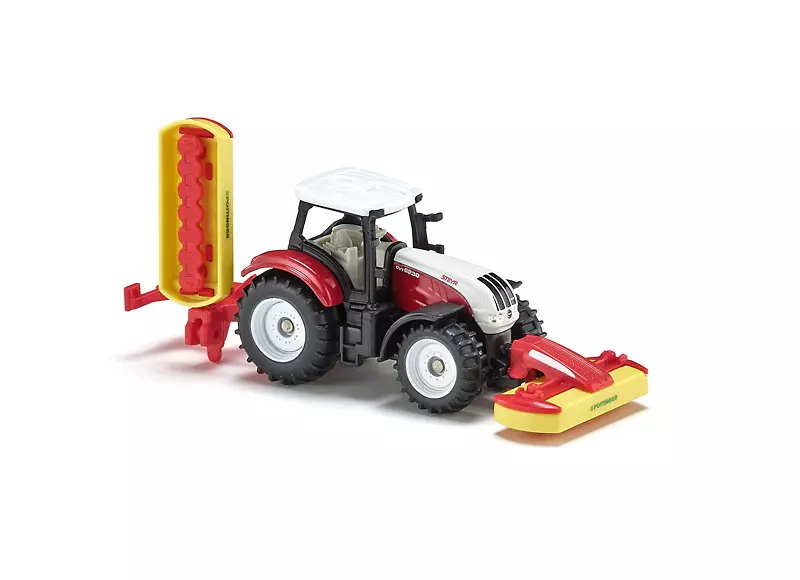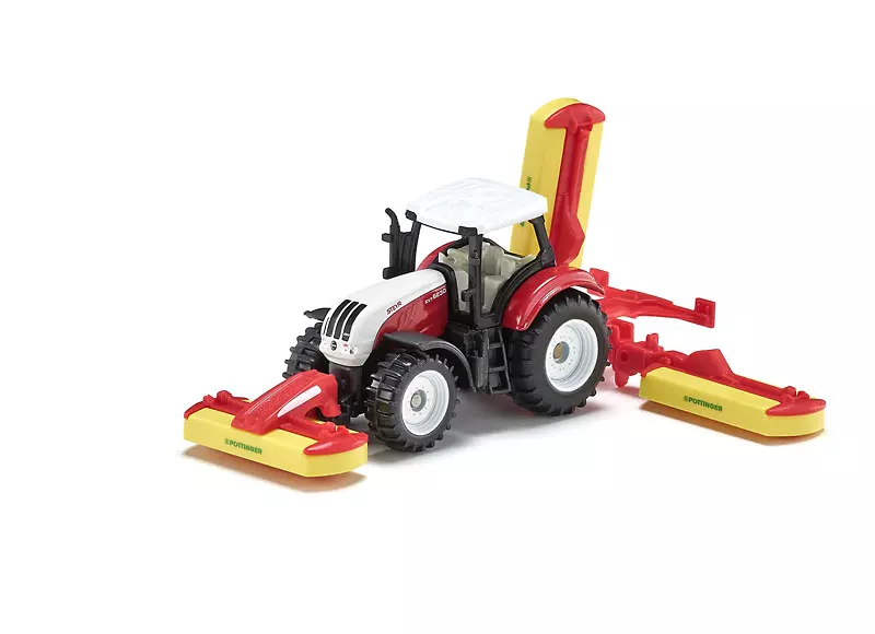 Model traktora Steyr z zestawem kosiarek dyskowych marki Pöttinger. Po zakończonym koszeniu kosiarki można odłączyć, a traktor użyć do innych prac rolniczych. Na czas dojazdu do miejsca koszenia ramiona kosiarki można złożyć.