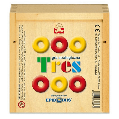 „Tres” to gra strategiczna, która wywodzi się z popularnej, wszystkim znanej gry w kółko i krzyżyk. Przeznaczona jest dla 2 graczy, których zadaniem jest zajmowanie na przemian pól na planszy poprzez nakładanie krążków w swoim kolorze na umieszczone na niej drążki. Każdy gracz dąży do tego, aby jak najszybciej zająć 3 miejsca w 1 linii: poziomo, pionowo, na skos w płaszczyźnie lub w przestrzeni jednocześnie utrudniając to samo przeciwnikowi. Wygrywa ta osoba, która jako pierwsza ułoży 3 swoje krążki w jednej linii. Dzięki temu, że gracze mogą układać swoje linie również na wysokość, gra jest dużo ciekawsza i bardziej emocjonująca. Wymaga skupienia i koncentracji. Pozwala ćwiczyć spostrzegawczość, myślenie logiczne i strategiczne. Tres znana gra, której nie znacie. Zawartość opakowania: • drewniana podstawa • 24 krążki w dwóch kolorach: 12 żółtych + 12 czerwonych, • instrukcja, • drewniane pudełko o wymiarach: 14.5 x 14.5 x 9.0 cm.