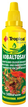 Przyspiesza wzrost oraz intensyfikuje wybarwienie ryb. Już po 14 dniach stosowania preparatu Kobaltosan można zauważyć, że kolory ryb stają się bardziej wyraziste i pełne blasku. Kobaltosan szczególnie polecany jest do akwariów z rybami żyworodnymi, np. gupikami, mieczykami, molinezjami itp. Wieloletnie obserwacje potwierdzają również wpływ jonów kobaltu na wzrost, rozwój i intensyfikację barwy czerwonych roślin wodnych. Zalecamy stosowanie preparatu przy każdorazowej podmianie wody w akwarium.