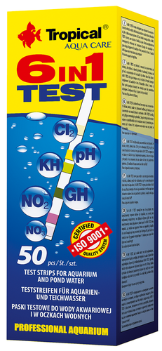 6 in 1 Test to paski testowe do wody akwariowej i w oczkach wodnych. 6 in 1 Test jest przeznaczony do pomiaru stężenia azotanów i azotynów, twardości ogólnej i węglanowej, odczynu pH oraz stężenia chloru całkowitego w wodzie słodkiej. Jest bezpieczny, nietoksyczny i łatwy w użyciu, wystarczy zamoczyć pasek w badanej wodzie i odczytać po chwili wartości sześciu parametrów chemicznych. Uzyskana szybko informacja o parametrach chemicznych wody umożliwia, w razie konieczności, natychmiastowe podjęcie działań, które poprawią warunki życia ryb.