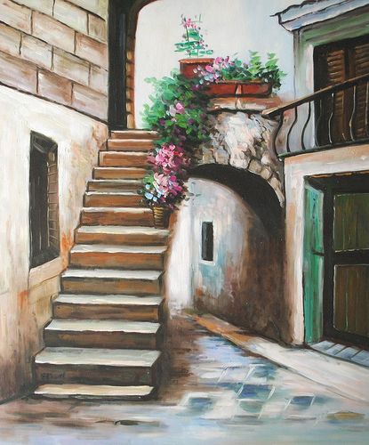 Obraz olejny przedstawiający uliczkę! Atrakcyjna technika wykonania i piękna kolorystyka. Niepowtarzalna dekoracja do wnętrz!