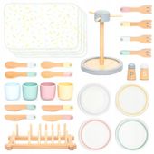 Ten wyjątkowy 33-częściowy drewniany zestaw do nakrywania stołu oferuje kompletne wyposażenie dla czterech osób, zawierając talerze, sztućce (noże, widelce, łyżki), kubki oraz praktyczne stojaki. Kolorowe podkładki z wesołymi wzorami oraz funkcjonalna solniczka z pieprzniczką sprawiają, że każda zabawa staje się niezwykle realistyczna i angażująca.