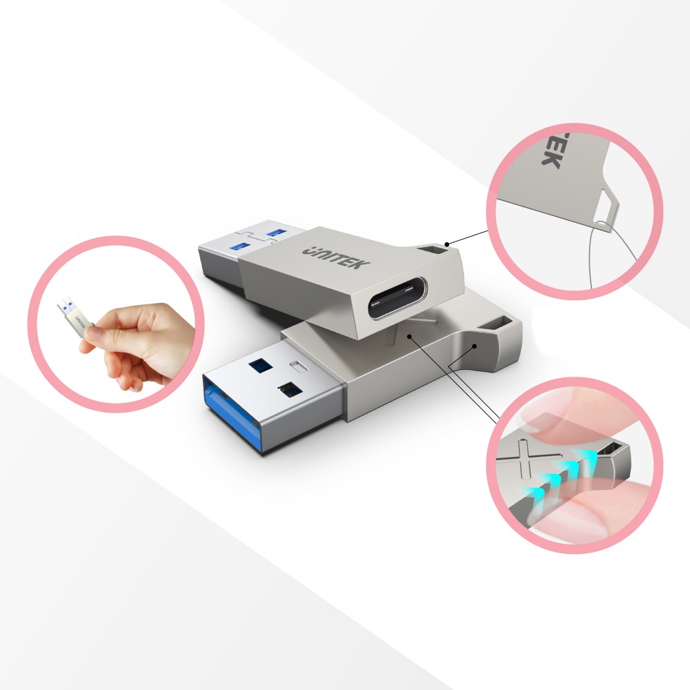 Obudowa konwertera USB-A na USB-C jest zrobiona z trwałego stopu cynku i ma dziurkę do zawieszenia np. jako breloczek przy kluczach, tak jak niektórzy noszą pendrive'y. Adapter przeszedł rygorystyczne testy - gwarantowana wytrzymałość 10 tysięcy podłączeń bez poluzowania wtyków.