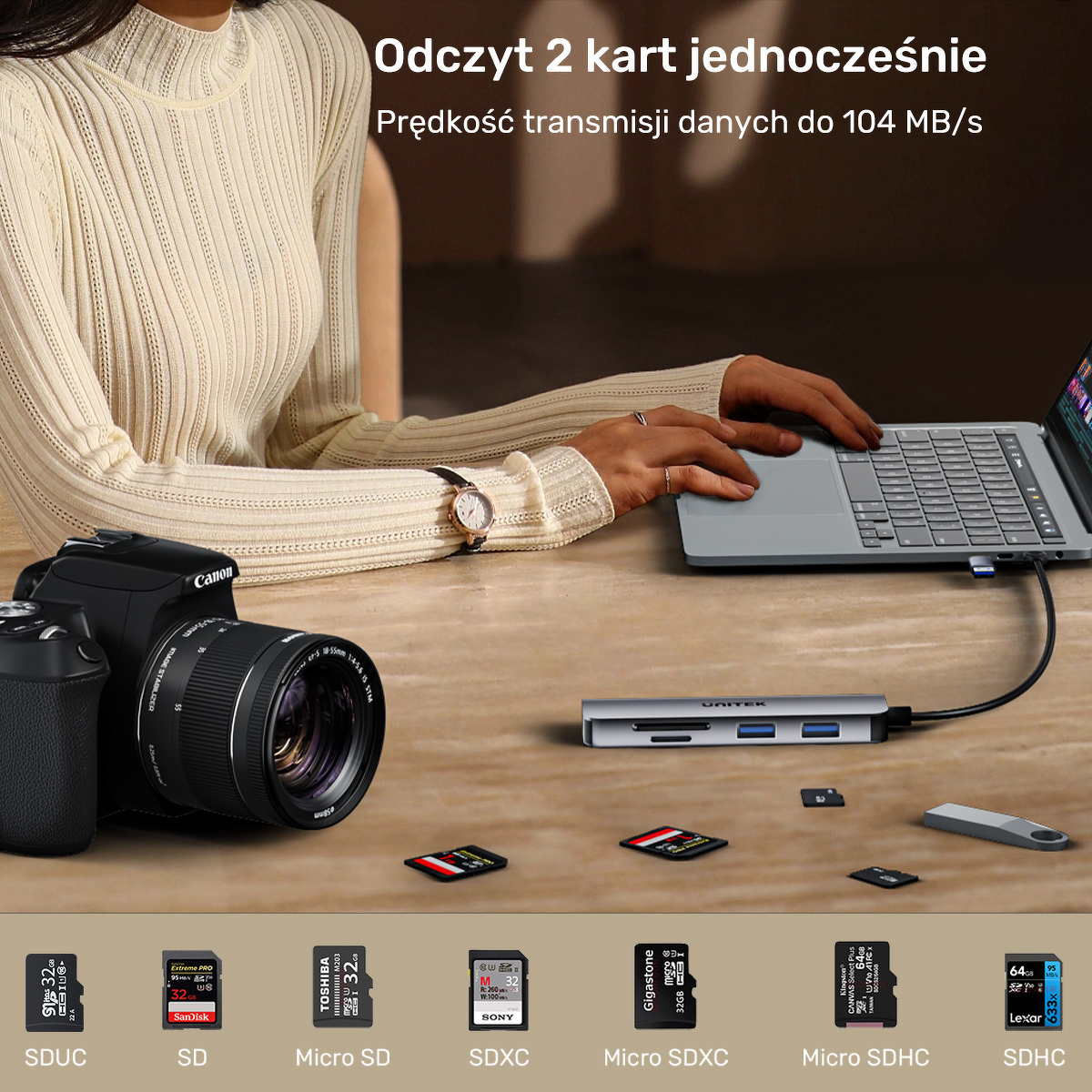 Lekka i smukła konstrukcja sprawia, że uHUB P5+ jest idealnym towarzyszem w podróży. Zmieści się w każdej torbie, co umożliwia korzystanie z niego, gdziekolwiek jesteś. Jego wyjątkowo przenośna konstrukcja jest idealna dla osób, które często przemieszczają się i potrzebują niezawodnego narzędzia do rozbudowy portów.