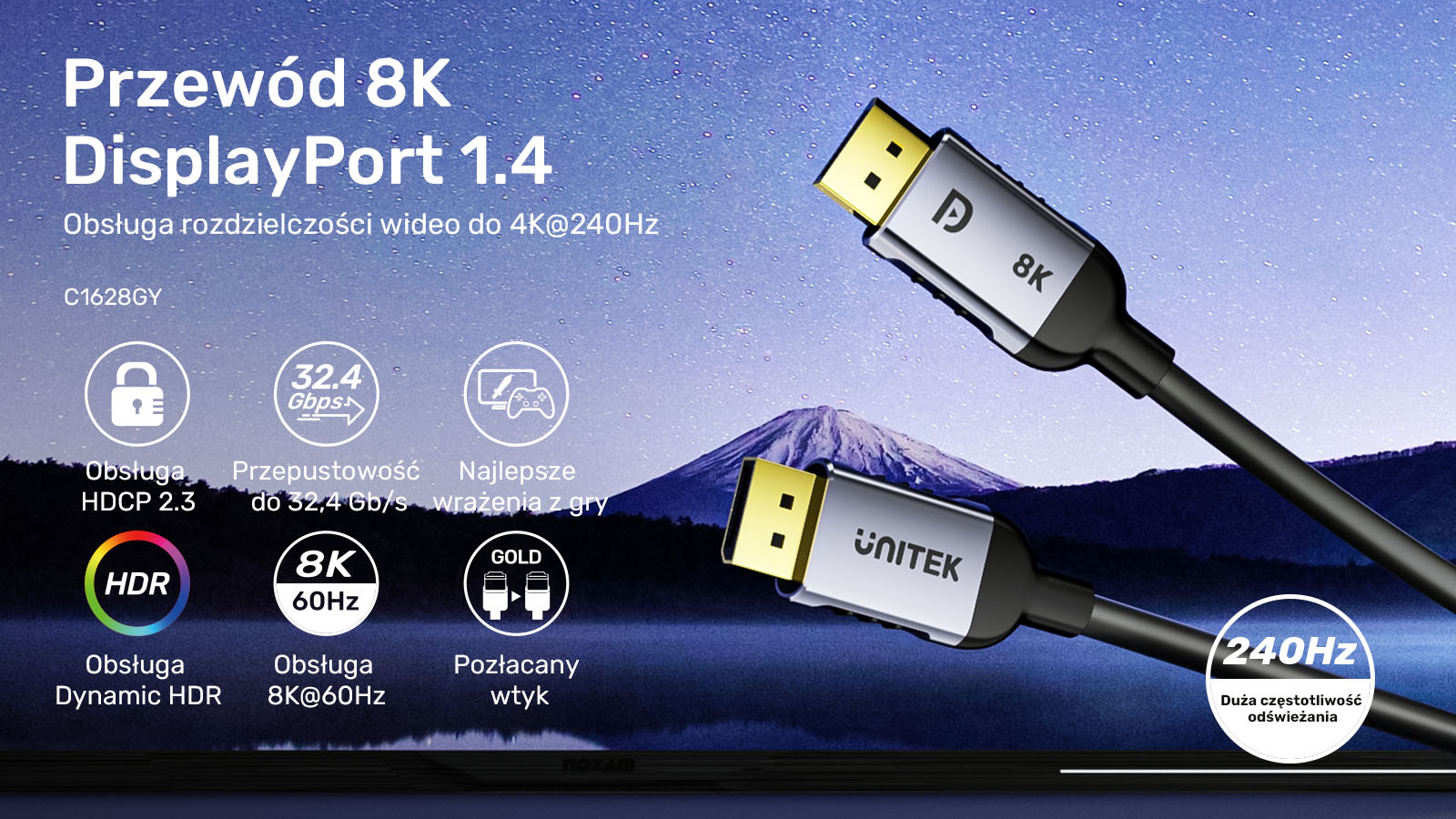 Przy zadaniach takich jak tworzenie grafiki komputerowej, retusz zdjęć, obróbka filmów, czy przesyłanie obrazu na zestawy VR jakość sygnału video jest kluczowa. Niestety, często czynnikiem uniemożliwiającym przesył obrazu o odpowiedniej jakości i blokującym przepustowość całego zestawu nie jest komputer, ani wyświetlacz, a łączący je kabel. Kabel DisplayPort 1.4 Unitek C1628GY01-2M prześle sygnał audio i video w najwyższej jakości, a dzięki obsłudze HDR sceny na ekranie będą tak żywe jak w świecie rzeczywistym!