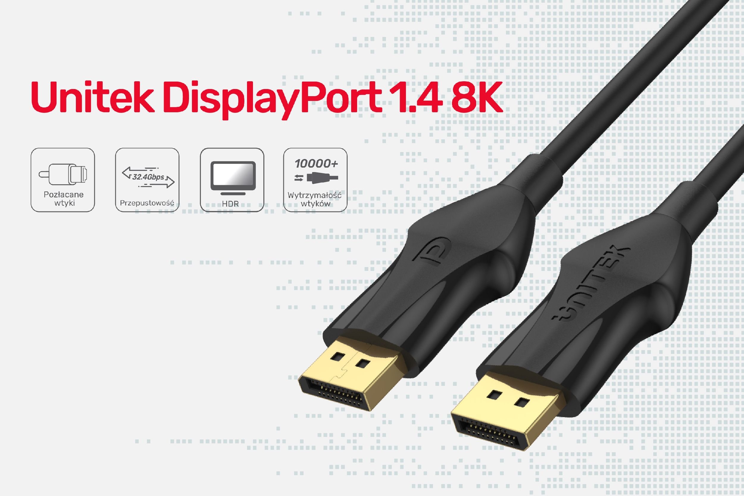 Kabel Unitek DisplayPort 1.4 wykonany z odpornego na korozję pozłacanego złącza oraz izolowanymi przewodami doskonale sprawdzi się przy urządzeniach obsługujących standard 8k oraz 4k. Przepustowość do 32,4 Gbps gwarantuje szybki i stabilny transfer danych. Przewód podłączysz do laptopa, konsoli, monitora czy odtwarzacza BlueRay. Trwałą konstrukcję zapewniają pozłacane wtyki i wyprofilowany uchwyt.