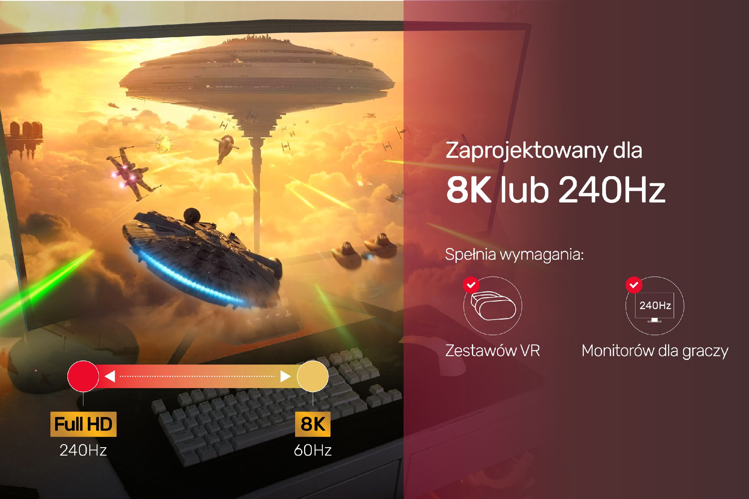 Dzięki obsłudze Display Steram Compression 1.2 (DSC), FEC oraz Dynamic HDR możesz cieszyć się najwyższą jakością obrazu 8k przy częstotliwości odświeżania do 240 Hz. Kabel doskonale sprawdza się przy obsłudze 3D oraz VR.